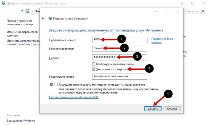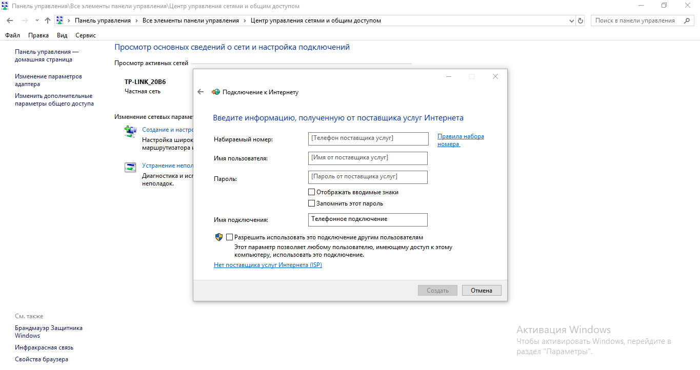 - Всё остальное вводим в соответствии с данными, которые предоставил вам провайдер. Имя пользователя — название поставщика услуг (то есть имя профиля — информация в таблице выше). Если есть пароль, вводим и его. Жмём на «Создать». В итоге должен появиться доступ к сети.