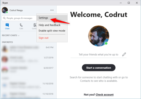 На компьютере с Windows запустите Skype, а затем откройте его настройки, нажав или коснувшись кнопки «Дополнительно». Это похоже на три точки подвески, и оно находится справа от вашего имени.