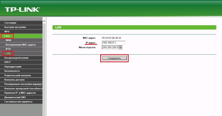 Авторизуйтесь в настройках TL-WR702N и дайте команду «Сеть — LAN» и введите (если хотите сменить IP-адрес) новое значение IP локальной сети (LAN).