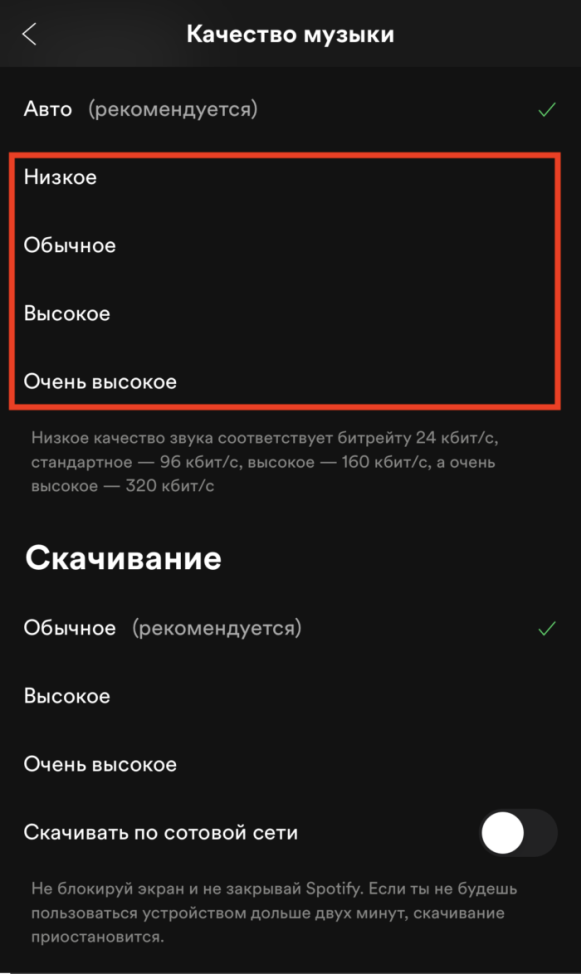 Spotify имеет четыре различных качеств звучаний, доступных на мобильных устройствах: