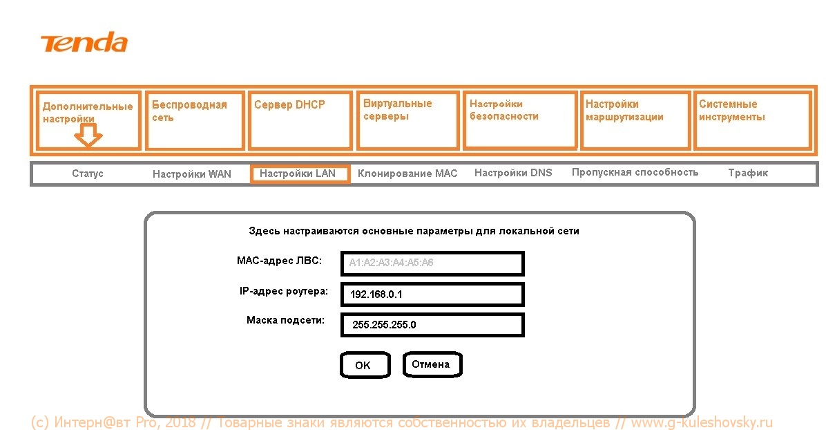 LAN имеет IP-адрес основного шлюза, без которого роутер не раздавал бы интернет и ресурсы ЛВС. Дайте команду «Основные настройки — Настройка LAN» и введите IP основного шлюза роутера.