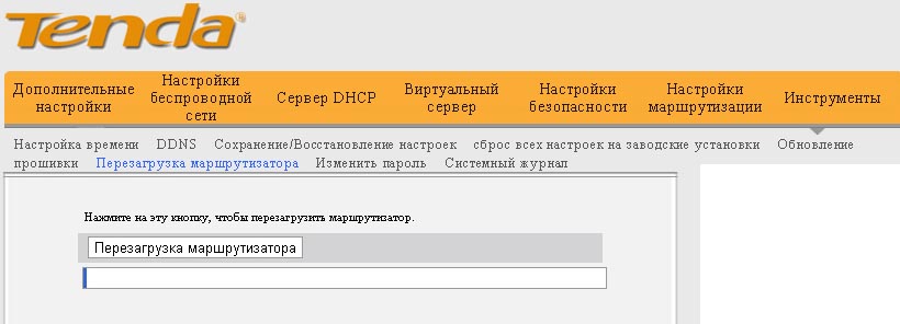 Перезапуск маршрутизатора Tenda F300 выполняется как с помощью кратковременного выключения питания или с кнопки перезапуска/WPS, так и программно. Дайте команду «Инструменты — Перезагрузка маршрутизатора».