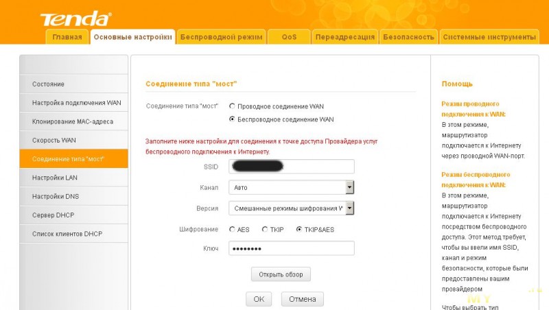 - Дайте команду «Основные настройки — Режим моста» и включите опцию «Беспроводное соединение WAN».