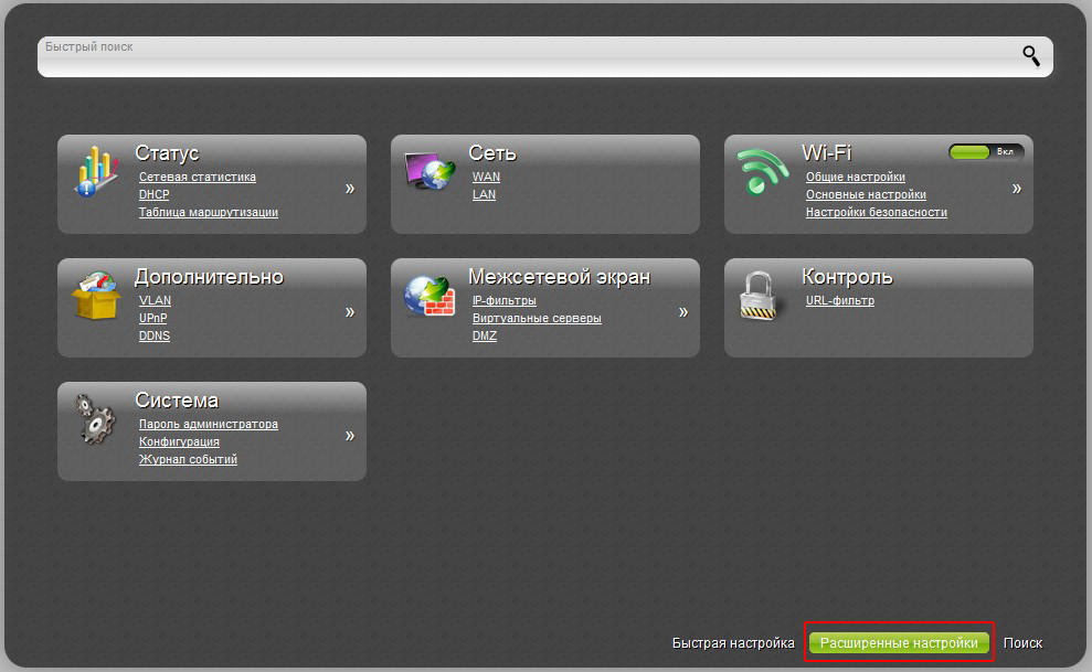 1. Войти в меню настроек роутера, где внизу экрана выбрать опцию «Расширенные настройки».