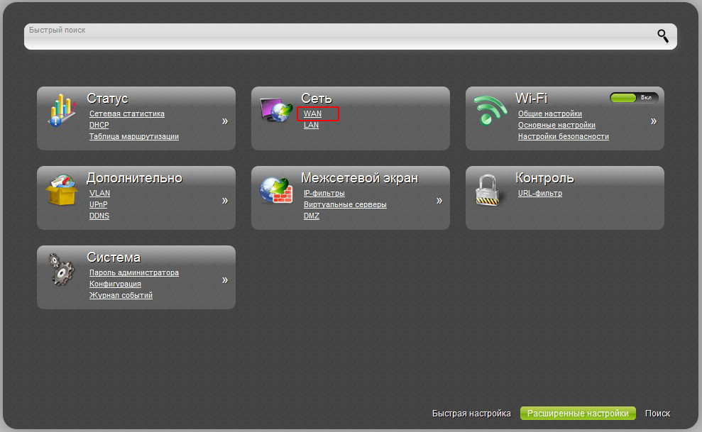 Выбрав пункт «WAN», пользователь попадёт в настройки интернет-соединения