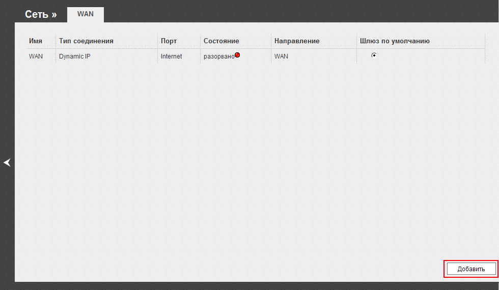 3. Внизу появившегося окна, отображающего состояние WAN-подключения, нажать кнопку «Добавить» для создания нового соединения.