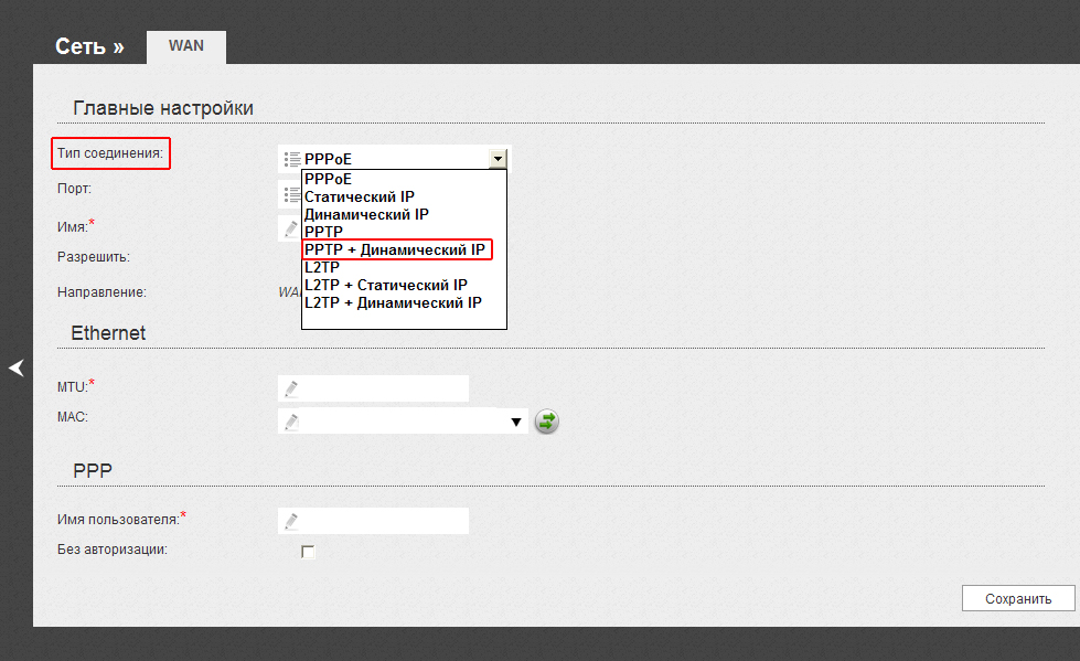 4. В открывшейся вкладке, в разделе «Главные настройки» из выпадающего списка выбрать нужный тип соединения, например, «PPTP + Динамический IP».