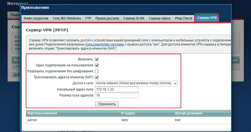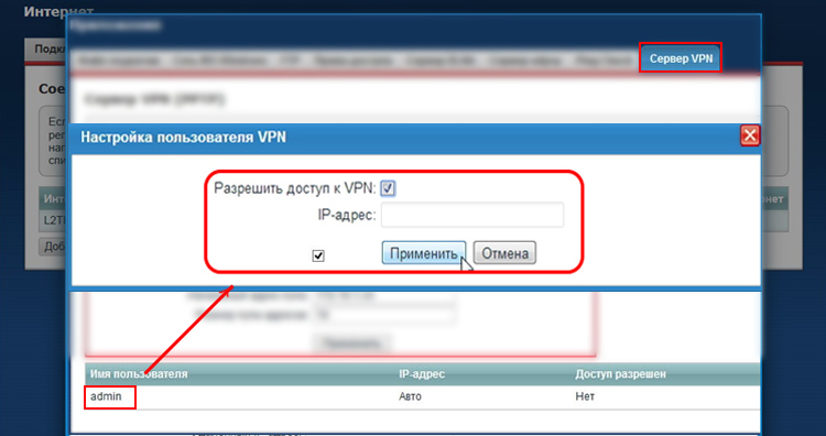 3. Перейти в раздел ниже для настройки учётных записей пользователей. Здесь кликнуть по имени admin и в появившемся окошке поставить галочку напротив «Разрешить доступ к VPN», после чего применить изменения.