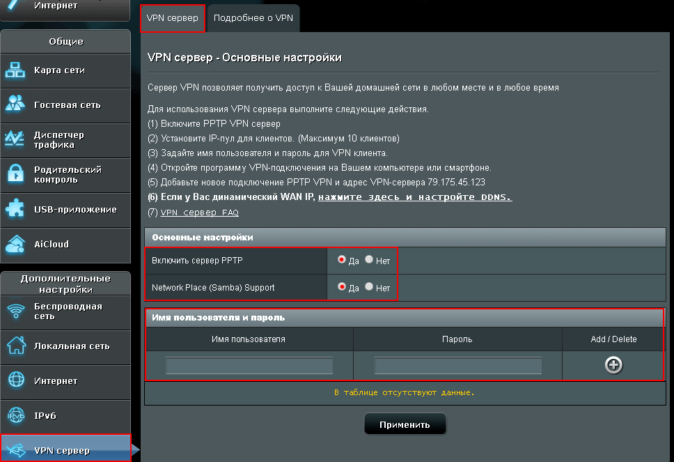 Вкладка «VPN-сервер» в админ-панели роутера Asus