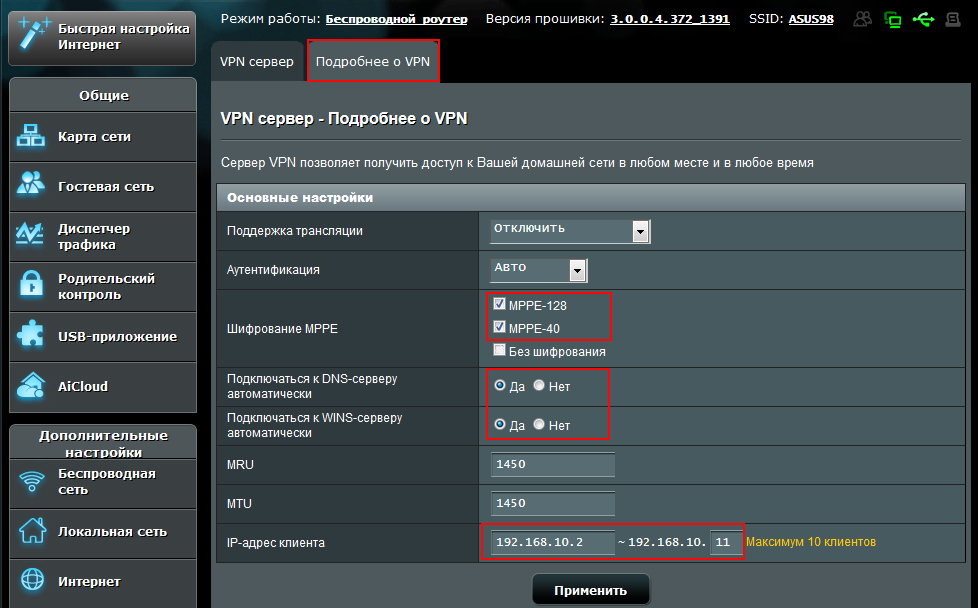 4. Во вкладке «Подробнее о VPN» выбрать тип шифрования (MPPE-128, MPPE-40 либо режим без шифрования), задать диапазон IP-адресов для клиентов, при необходимости активировать автоматическое подключение к DNS и WINS-серверам.