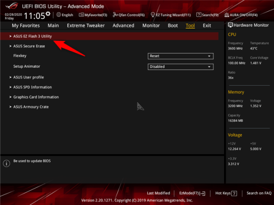 Некоторые усовершенствованные материнские платы имеют BIOS, которые позволяют вам проверять наличие доступных обновлений, а также обновлять BIOS напрямую из Интернета. Так обстоит дело с одной из наших материнских плат — ASUS ROG Crosshair VIII Hero (Wi-Fi). Если у вас есть эта функция в BIOS вашей материнской платы, подключите кабель Ethernet от маршрутизатора к материнской плате. Затем откройте BIOS и найдите инструмент обновления BIOS. У инструмента могут быть разные названия, в зависимости от модели вашей материнской платы. Например, на нашей материнской плате ASUS она называется EZ Flash 3.