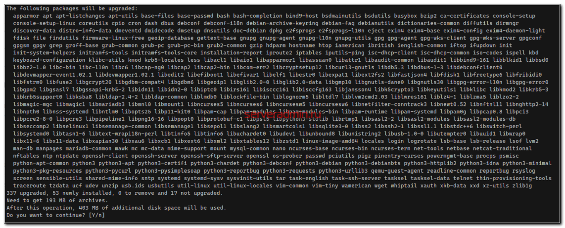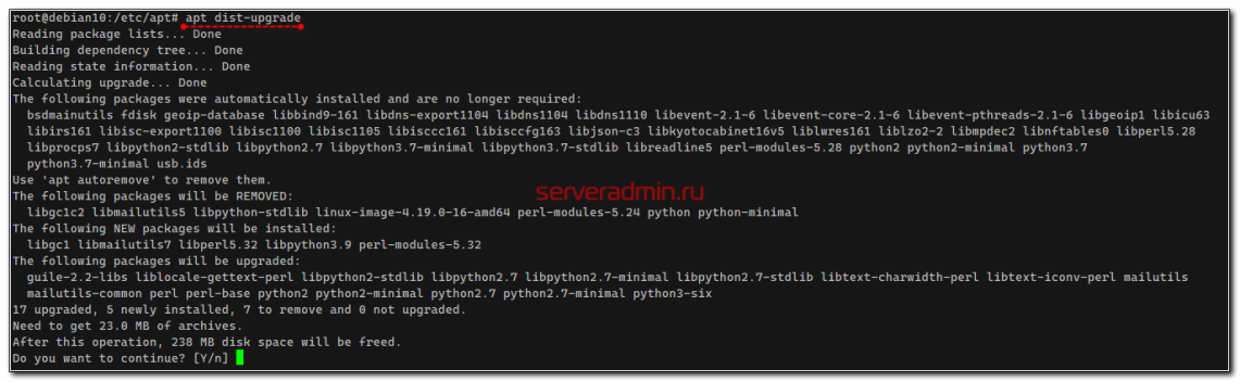 Теперь можно запустить непосредственно обновление системы Debian 10 до 11 версии. Перед этим обязательно убедитесь, что у вас есть доступ к консоли сервера, а не только ssh подключение. Обычно всё проходит нормально и одного ssh достаточно. Но если обновляете prod, лучше перестраховаться. Сначала обновим список пакетов.