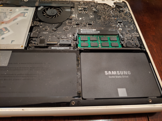 После того, как крышка снята, вы сможете обнаружить ОЗУ, так как в MacBook не так много деталей, которые можно удалить. На изображении выше ОЗУ — это маленький зеленый компонент над диском Samsung.