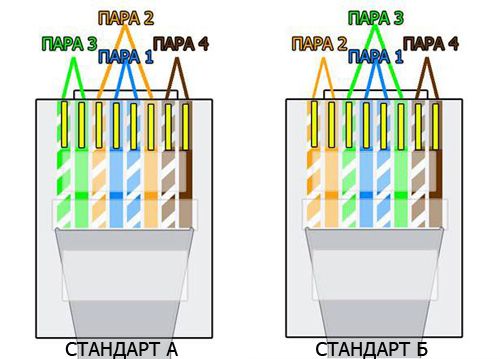 Для обжима коннектора существует два варианта. В простонародье они зовутся стандарт «А» (ЭЙ) и стандарт «Б» (БИ). По науке эти стандарты пишутся как TIA/EIA-568А и TIA/EIA-568B соответственно. Чаще всего всем нравится обжим по стандарту «Б». В пределах одной локальной сети нужно использовать один стандарт на выбор «А» или «Б».