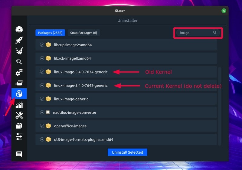 Сначала вам нужно запустить “Stacer”, а затем перейти к программе удаления пакетов, как показано на скриншоте ниже.