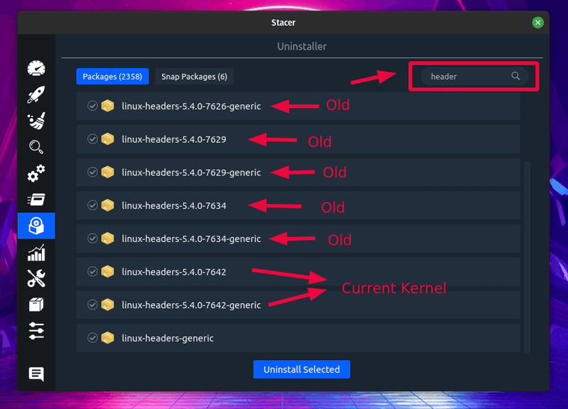 Для начала вы можете использовать Synaptic Package Manager или такой инструмент, как Stacer. Лично мы, когда столкнулись с полным разделом / boot со сломанным apt, использовал Stacer, чтобы избавиться от старых ядер. Итак, позвольте мне показать вам, как это выглядит.