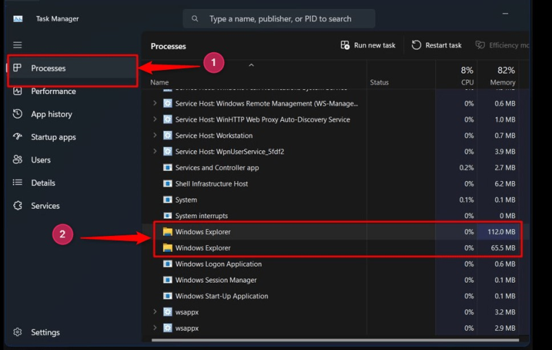В «Диспетчере задач» выберите «Процессы» на левой панели, прокрутите вниз и найдите «Проводник Windows». Не волнуйтесь, если вы видите несколько экземпляров, поскольку иметь несколько экземпляров совершенно безопасно: