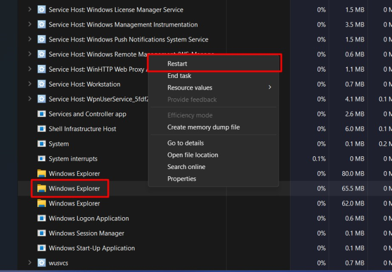 Найдя, щелкните правой кнопкой мыши процесс «Проводник Windows» и выберите в меню опцию «Перезапустить»: