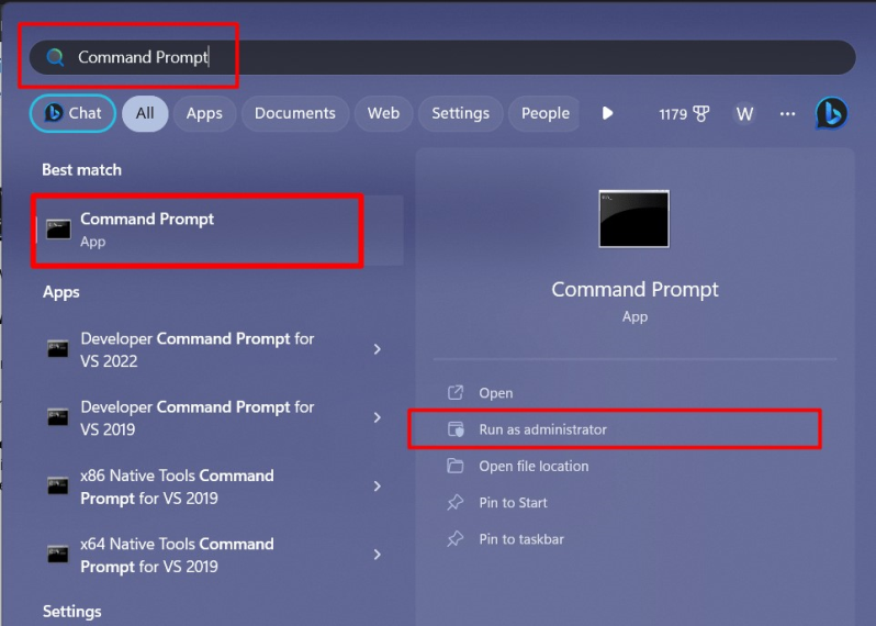 Сначала разверните меню «Пуск» Windows, нажав клавишу «Windows». После этого найдите «Командную строку» или «PowerShell» и запустите ее. Например, мы воспользуемся «Командной строкой»: