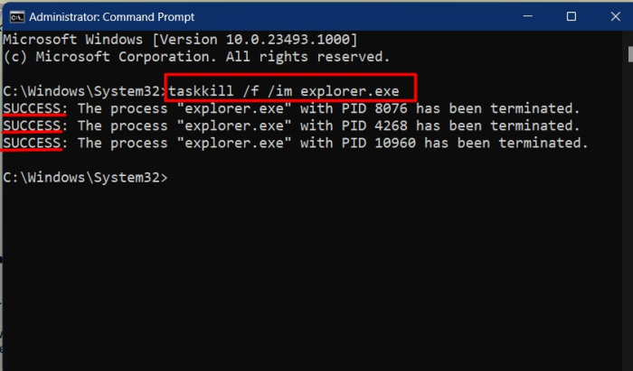 В «Командной строке» используйте следующую команду, чтобы остановить процесс «Проводник Windows»: