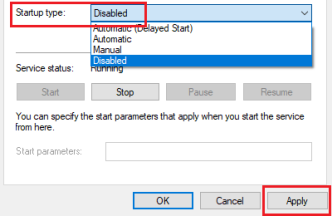 Измените тип запуска на Отключено. Нажмите «Применить», а затем «ОК», чтобы сохранить настройки.