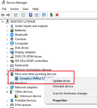 В диспетчере устройств разверните «Мышь и другие указывающие устройства». Щелкните правой кнопкой мыши драйвер сенсорной панели и выберите «Обновить драйвер».