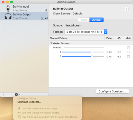 Вы получите лучший обзор всех устройств вывода с помощью утилиты Audio MIDI Setup. Откройте приложение (найдите его с помощью Spotlight с помощью Cmd + Space ) и выберите «Встроенный вывод». Здесь вы можете настроить аудиоканал, битовую глубину, формат и скорость.