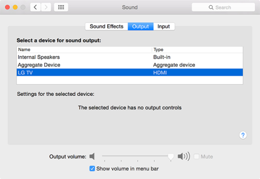 Перезагрузите ваш Mac. После этого откройте «Звук» → «Вывод» в «Системных настройках» и выберите свой телевизор в разделе «Выбор устройства для вывода звука».