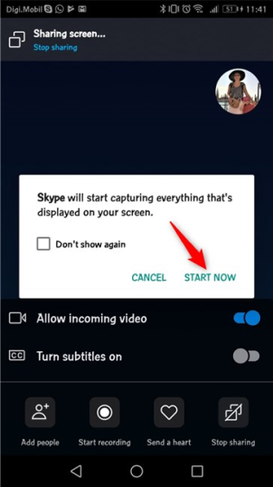 Skype спрашивает, согласны ли вы на то, чтобы «[…] начать захватывать все, что у вас на экране». Если вы хотите поделиться своим экраном, согласитесь с этим и коснитесь Начать сейчас. Если вы не хотите, чтобы Skype запрашивал у вас то же самое в следующий раз, когда вы открываете общий доступ к своему экрану, установите флажок «Больше не показывать».