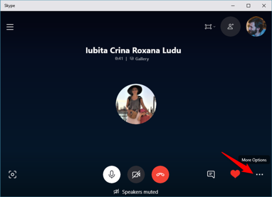 Когда человек, которому вы позвонили, отвечает на ваш звонок, Skype показывает что-то похожее на скриншот ниже. Нажмите или коснитесь кнопки … (Дополнительные параметры) в правом нижнем углу приложения.