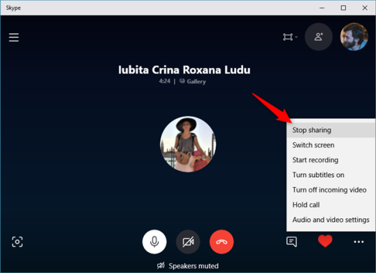 Если вы больше не хотите делиться своим экраном в Skype, нажмите красную полосу в верхней части экрана, а затем нажмите «Стоп».