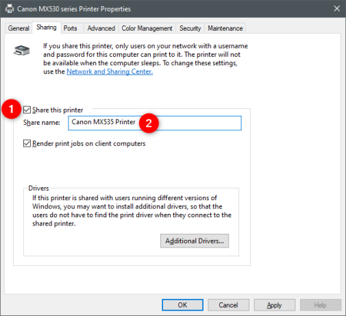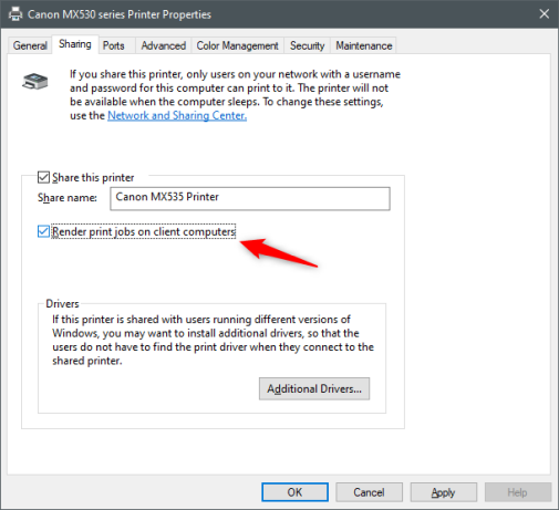 В поле «Имя общего ресурса» параметр «Отображать задания печати на клиентских компьютерах» включен по умолчанию. Мы рекомендуем оставить его включенным, поскольку рендеринг заданий на печать на клиентских устройствах означает, что эти задания на печать обрабатываются устройствами, которые их запускают, а не компьютером, к которому подключен принтер. Другими словами, клиентские устройства отвечают за обработку печати, поэтому вашему компьютеру с Windows 10 не нужно выполнять дополнительную работу, когда дополнительный компьютер пытается что-то напечатать на общем принтере.