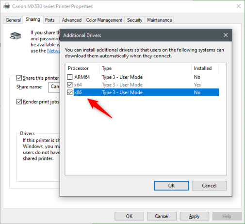 Откроется окно «Дополнительные драйверы». В нем выберите дополнительные драйверы, которые вы хотите предоставить для сетевых компьютеров и устройств, которые подключаются к вашему общему принтеру. В зависимости от вашего принтера у вас должны быть опции для включения дополнительных драйверов для различных типов процессоров и архитектур операционной системы. Выберите дополнительные драйверы, которые вы хотите установить для вашего общего принтера, а затем нажмите или нажмите OK . Однако обратите внимание, что на следующем шаге вы должны указать Windows 10, где можно получить дополнительные драйверы, поэтому вам следует загрузить их с веб-сайта поддержки вашего принтера до этого.