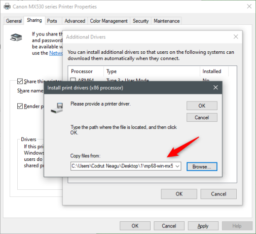 Windows 10 спросит вас, где взять драйверы принтера, которые вы выбрали на предыдущем шаге. Найдите или введите путь к папке, содержащей дополнительные драйверы для вашего общего принтера.