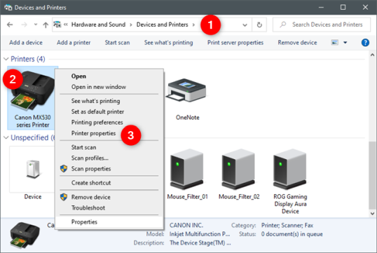 ПРИМЕЧАНИЕ. Существует также альтернативный способ открытия окна «Свойства» вашего принтера для предоставления доступа к принтеру в сети: откройте панель управления, перейдите в «Просмотр устройств и принтеров» в разделе «Оборудование и звук», щелкните правой кнопкой мыши (или нажмите и удерживайте) на принтер, а затем выберите Свойства принтера в контекстном меню.
