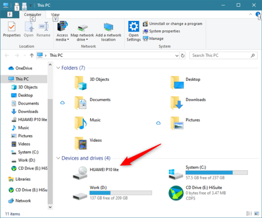 Затем на компьютере с Windows 10 откройте проводник или любой другой файловый менеджер, который вы предпочитаете. В разделе «Этот компьютер» вы увидите новое устройство с названием вашего смартфона на Android. Дважды щелкните или дважды нажмите на него.