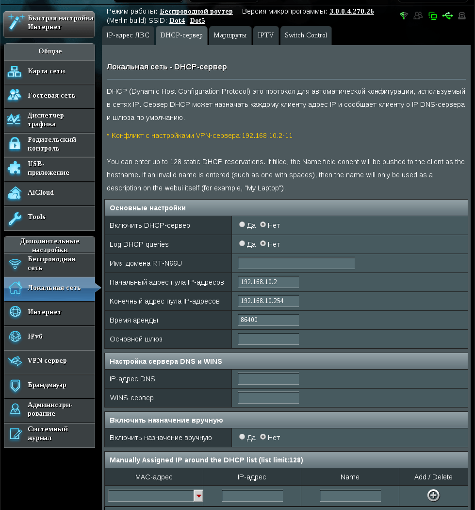 Функция DHCP — это «раздатчик» IP-адресов устройствам, в которых эти адреса не указаны вручную. Сервер DHCP назначает IP-адреса из диапазона нумерации по маске 255.255.255.0. В этом примере IP берутся из диапазона 192.168.1.2 — 192.168.1.254. Это делается для предотвращения IP-конфликта — если сервер DHCP обнаруживает, что, например, адрес 192.168.1.123 уже используется, то роутер выдаст ближайший адрес, не занятый каким-либо устройством в вашей локальной сети.