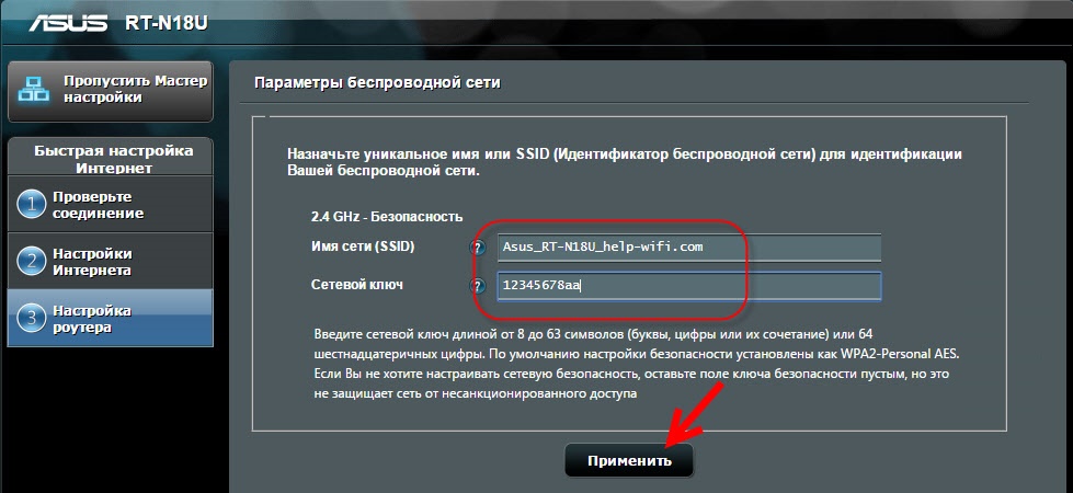 1. Введите имя сети Wi-Fi и ключ WPA-2. Без ключа ваш роутер будет подвергаться попыткам взлома со стороны злоумышленников.