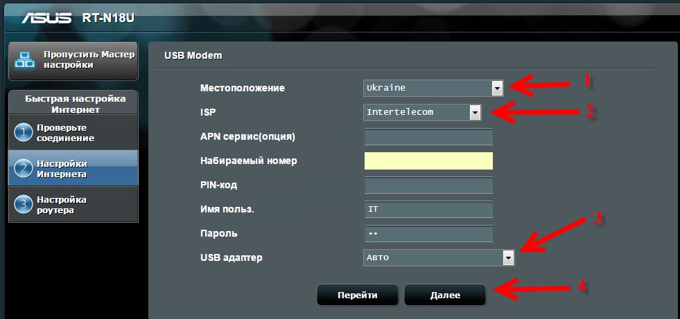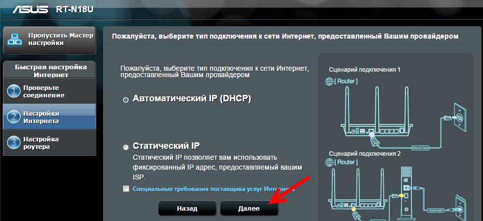 1. Выберите автоматический выбор USB-модема (модем выбирается из перечня поддерживаемых роутером Asus)? нажмите «Далее».