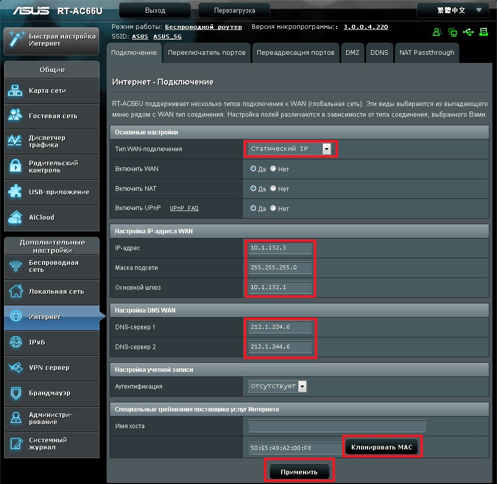 Также введите DNS-адреса, включите функции WAN, NAT (смена IP-адресов определённых пакетов сетевого трафика) и UPnP (эта функция облегчает настройку разных по назначению устройств, имеющих, например, Wi-Fi) и нажмите кнопку «Применить». Если настройки были верны — роутер выйдет в Сеть.