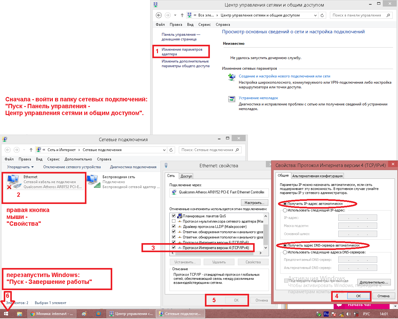 Если же у вас настройки IP были не автоматические (бывает, что адрес основного шлюза и второго DNS прописываются сами собой) — уберите эти значения, выбрав автоназначение IP-адресов, и перезапустите Windows.