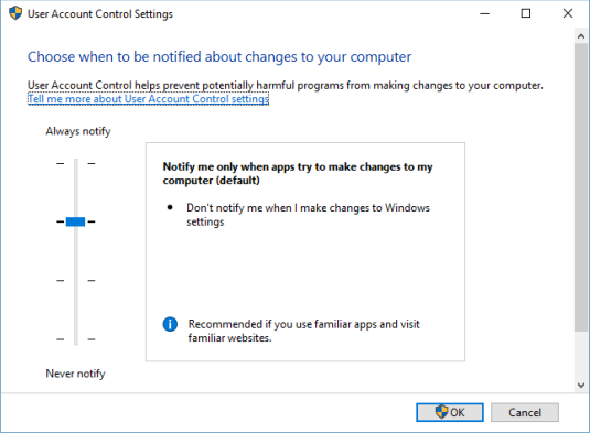 Чтобы проверить это, введите UAC в меню «Пуск» и нажмите «Изменить настройки контроля учетных записей». Убедитесь, что ползунок не установлен на нижнюю опцию Никогда не уведомлять. Второй вариант сверху является стандартным и должен работать нормально в большинстве случаев.