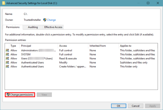 Убедитесь, что в группе «Администраторы» указан полный доступ для доступа. Если это не так, вы нашли причину, по которой вы не можете просматривать все файлы. Сначала нажмите кнопку «Изменить разрешения», чтобы внести изменения, затем дважды щелкните группу, чтобы изменить ее.