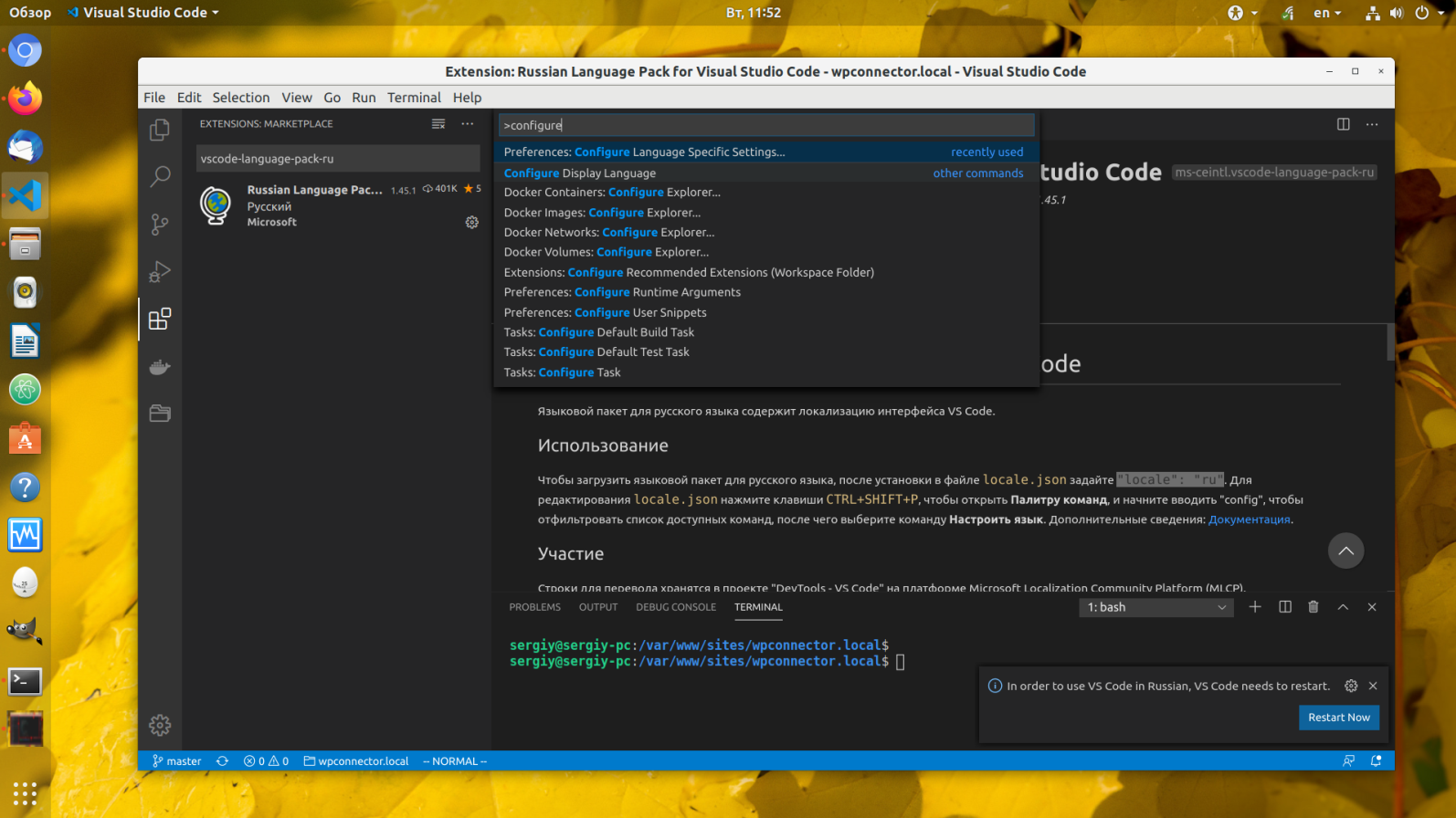 Для выбора языка нажмите Ctrl+Shift+P и начните набирать Config, в предложенном списке выберите Configure Display Language: