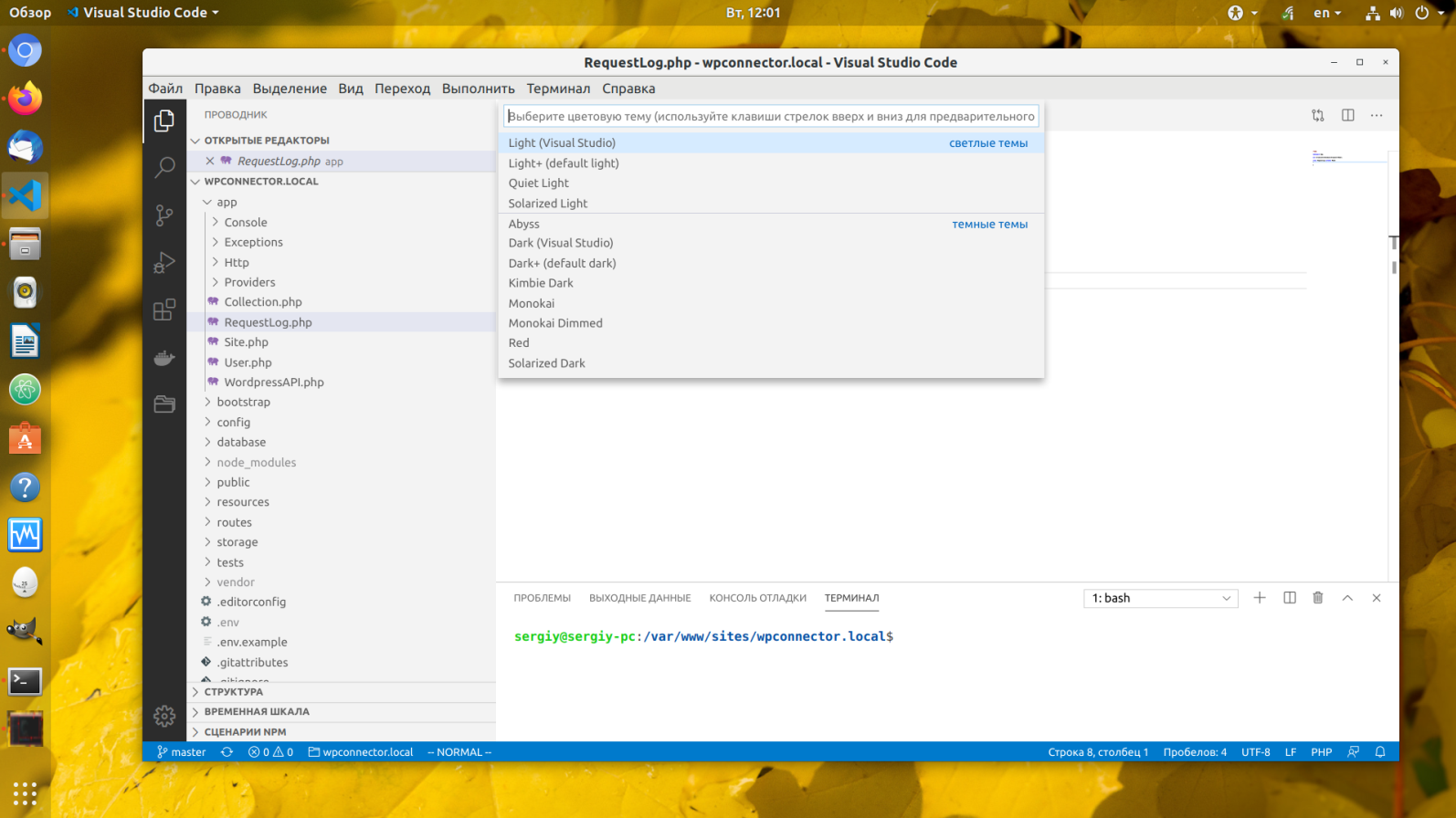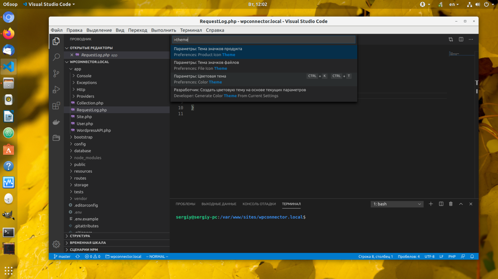 Одна из важных вещей для среды разработки — её внешний вид и тема оформления. Чтобы изменить тему оформления, надо нажать сочетание Ctrl+Shift+P и набрать Theme. Затем в меню надо выбрать Color Theme: