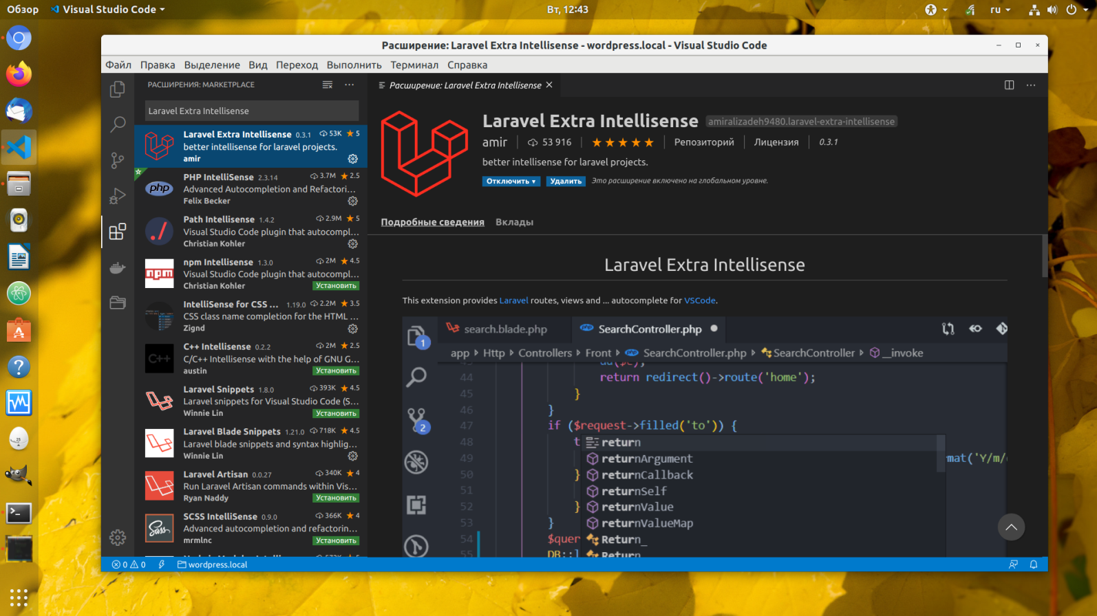Очень сильно помогает в разработке автоматическое дополнение кода. Вы пишите начало слова, а среда сама вам подсказывает, чем его можно завершить. Пакеты, которые позволяют выполнять автодополнение, называются *-intellisense. Рекомендуется установить PHP Intellisense, CSS Intellisense и Path Intellisense для автодополнения путей к файлам. Для разных фреймворков существуют свои расширения автоматического дополнения кода, например, для Laravel есть Laravel Extra Intellisense. Подсветка синтаксиса обычно уже встроена в VS Code для многих языков, однако если её нет, тоже ищите расширение.