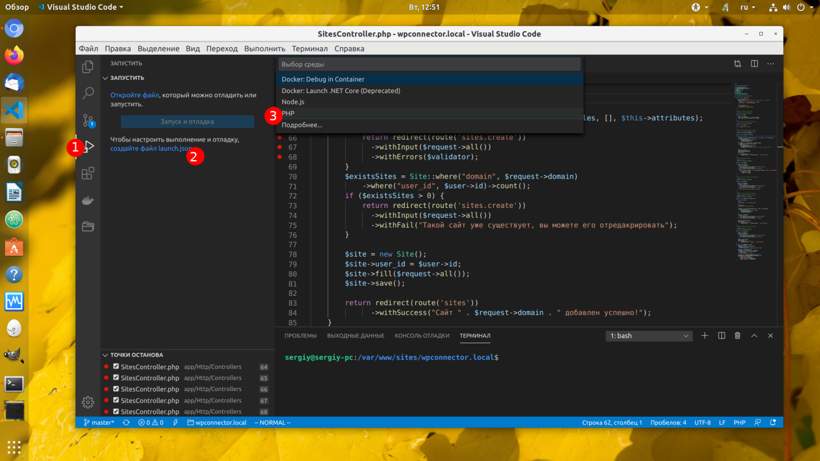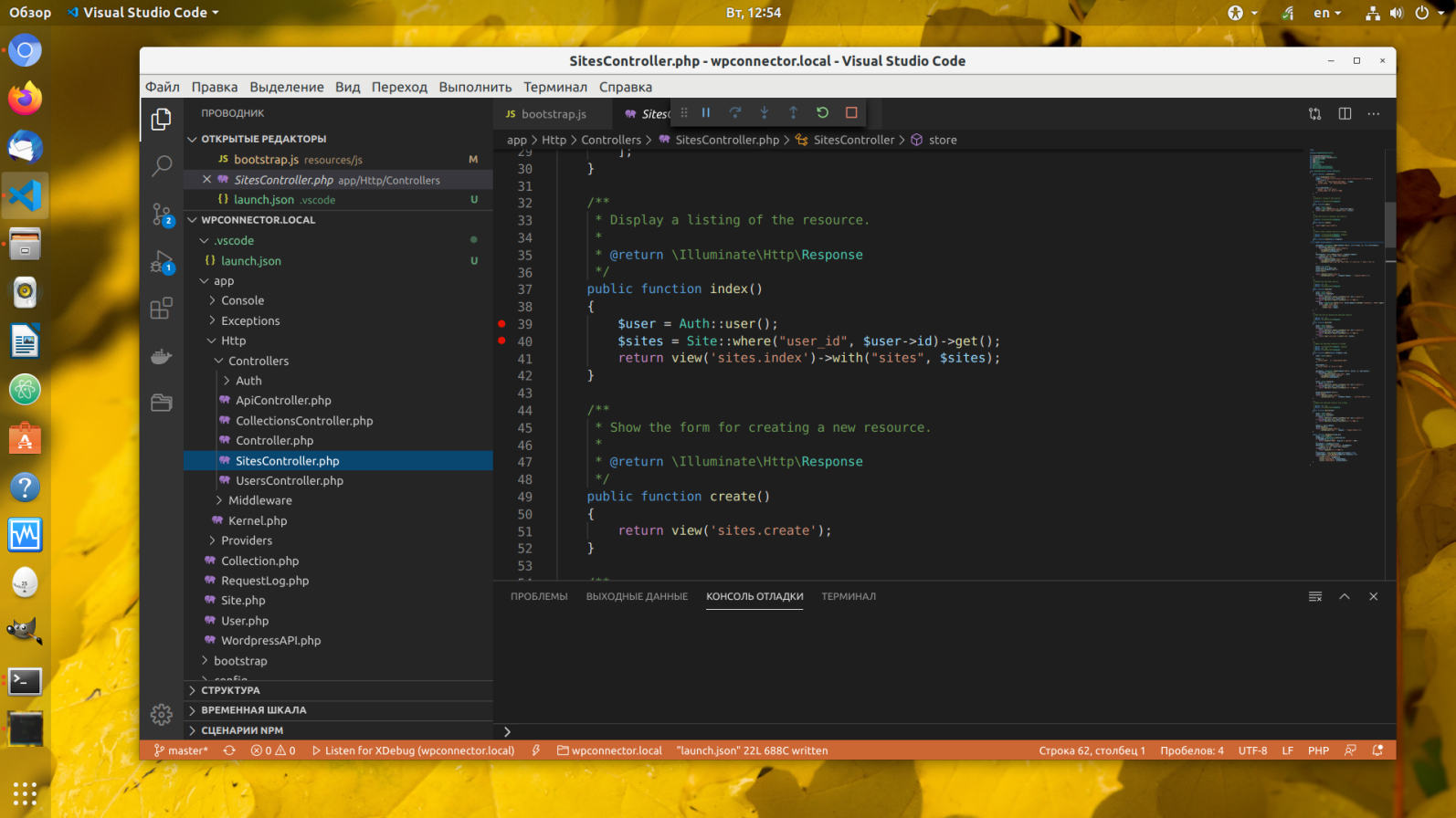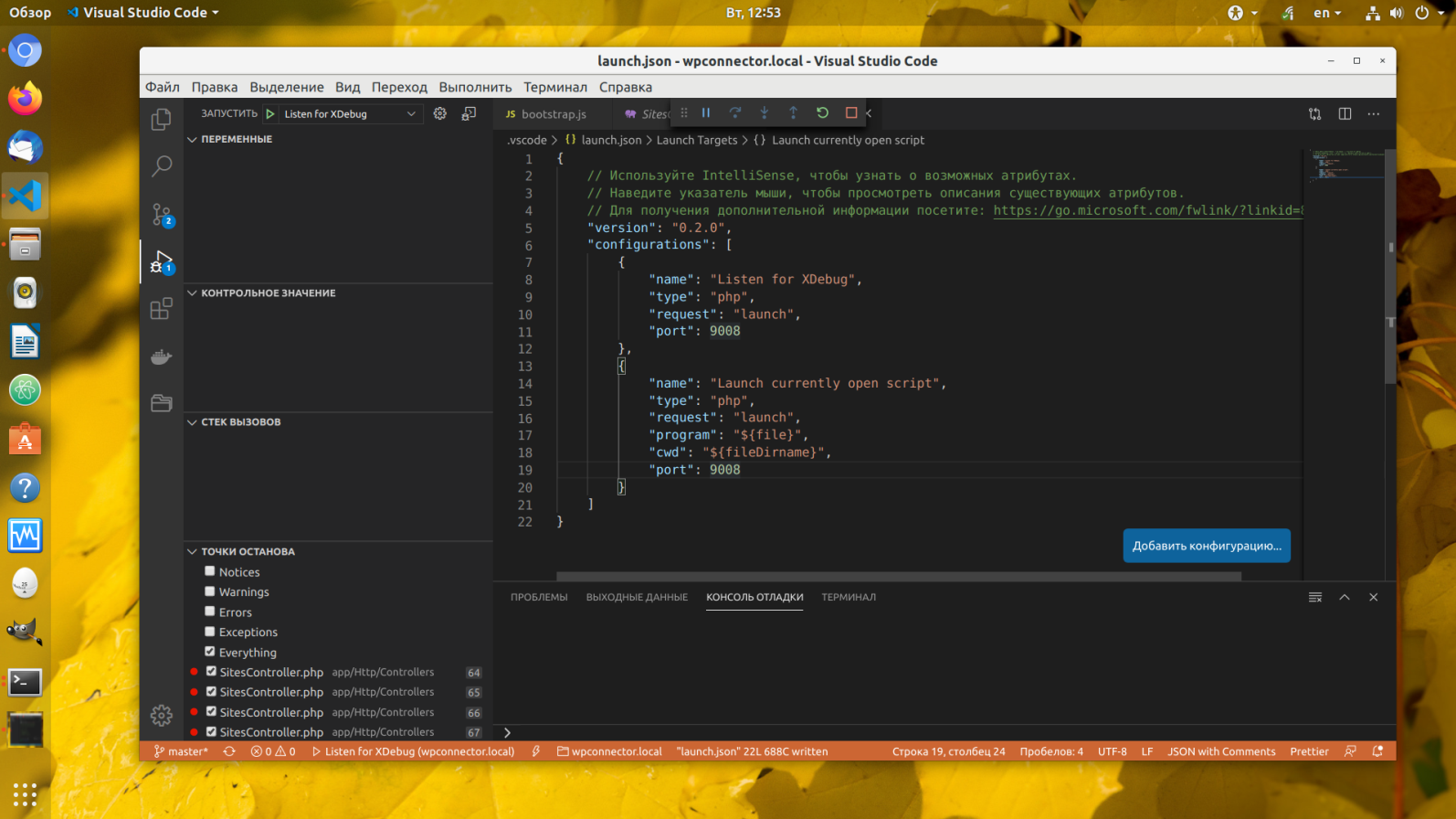 Затем Xdebug подключается к VS Code по выбранному нами порту и передаёт туда всю необходимую информацию. Только после этого вы сможете смотреть переменные и выполнять код пошагово:
