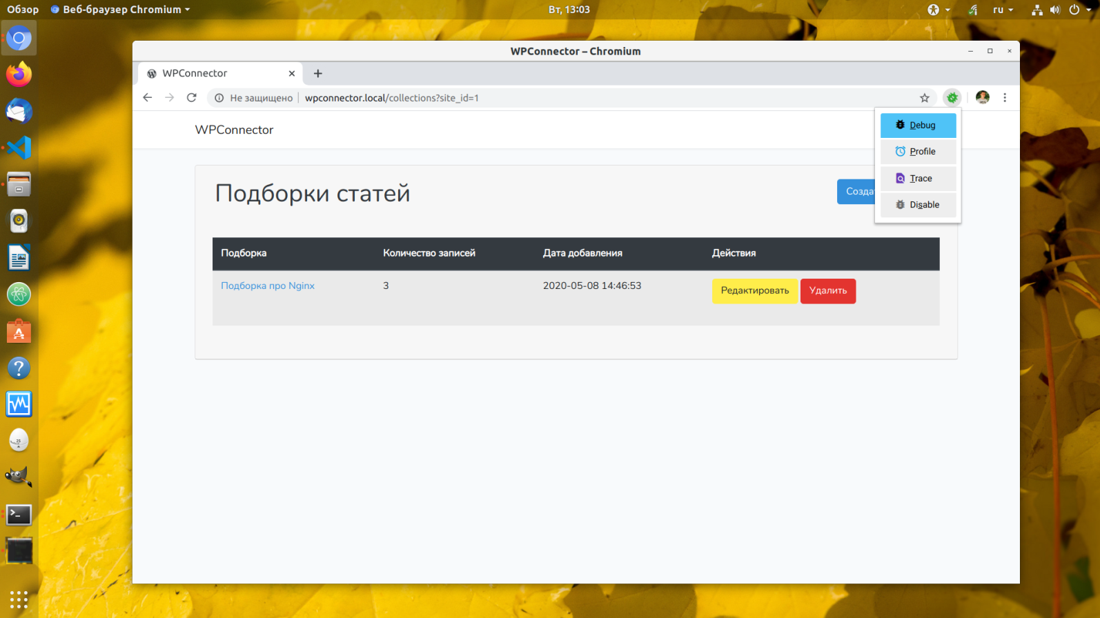 Последний шаг: надо открыть отлаживаемую страницу в браузере, но при этом для Chrome надо использовать расширение Xdebug Helper, которое включает необходимый флаг и сообщает Xdebug, что этот код надо отлаживать. Для этого надо выбрать режим Debug в расширении: