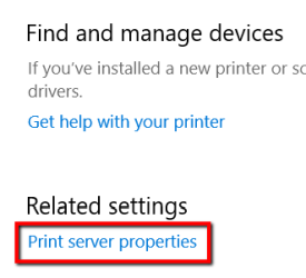 - Там прокрутите вниз к Связанным настройкам раздел. Далее вам нужно запустить свойства сервера печати.