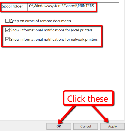 - На этой вкладке вы можете проверить папку spool. Вы также должны установить флажки, которые показывают следующее: Показывать информационные уведомления для локальных принтеров и Показать информационные уведомления для сетевых принтеров.